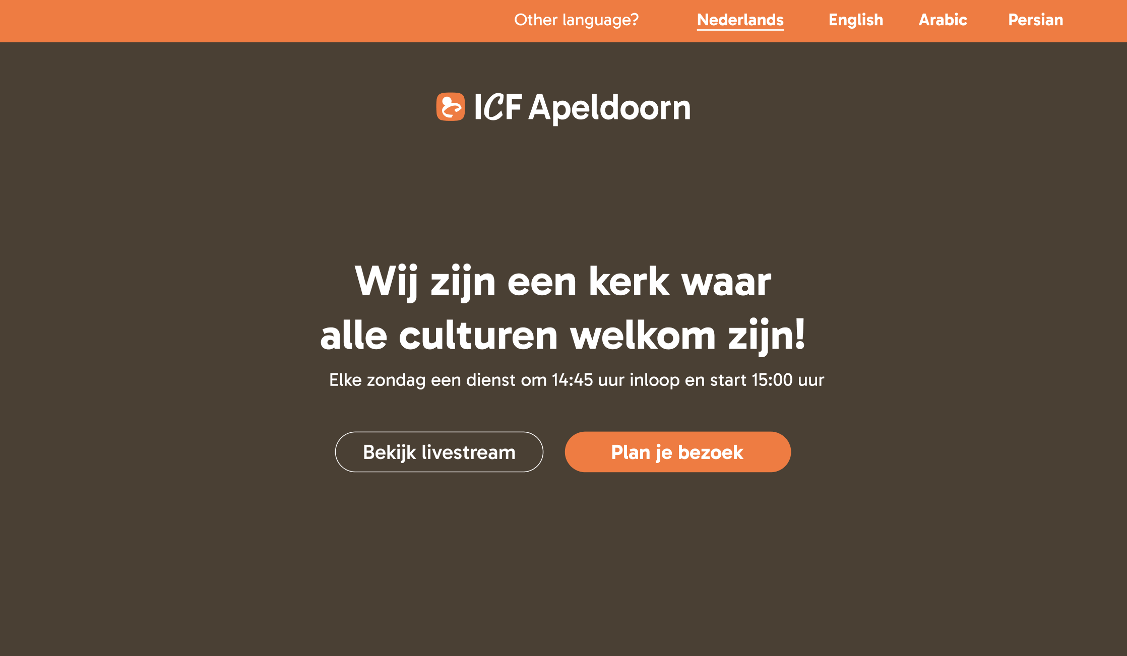 Hierboven een voorbeeld banner schets (zonder beeld) voor ICF Apeldoorn, een kerk die wij hielpen met een Kerkgroei traject. Het advies van ons: om een sprekend beeld of video toe te voegen op de achtergrond.